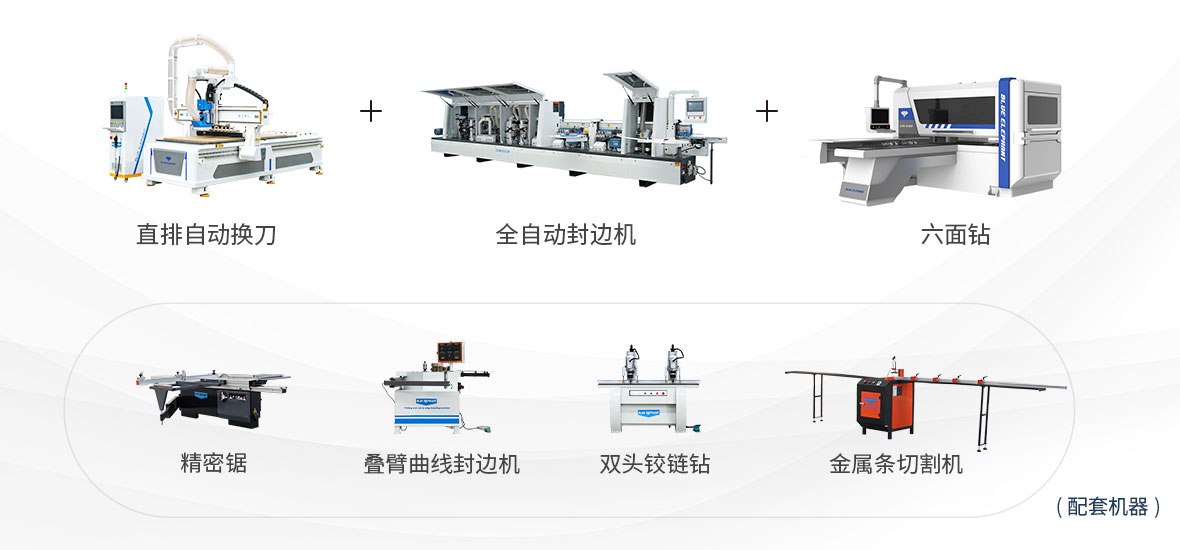 ?高端型-板式家具生產(chǎn)設(shè)備方案高端型板式家具生產(chǎn)設(shè)備方案主要由直排換刀加工中心、封邊機(jī)、六面鉆三個(gè)大設(shè)備及精密鋸、疊臂封邊機(jī)、雙主軸鉸鏈鉆、金屬條切割機(jī)等配套機(jī)器組成,可滿足全屋定制廠家的生產(chǎn)加工,機(jī)器